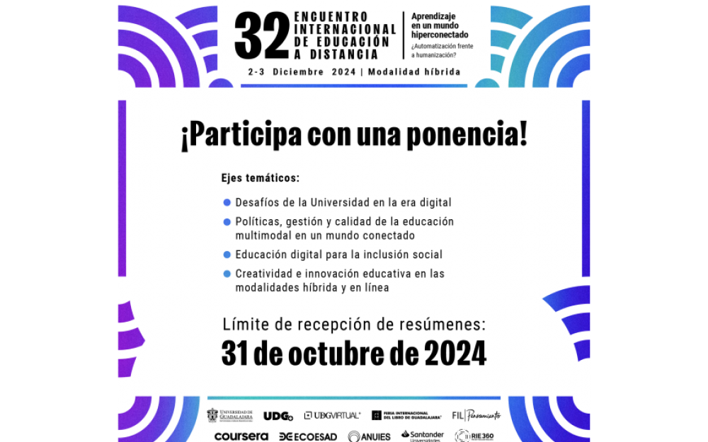 La Universidad de Guadalajara, a través de UDGPlus, invita a personas investigadoras, profesorado, estudiantes de la Red Universitaria y público en general, a presentar sus contribuciones en el 32 Encuentro Internacional de Educación a Distancia, un espacio para reflexionar sobre la construcción de futuros educativos desde la transformación digital.